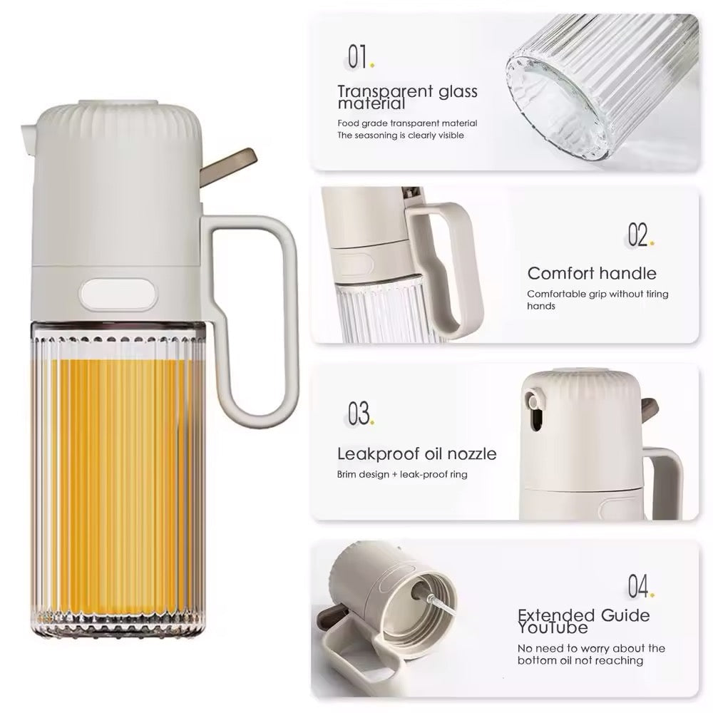 250ml glass oil spray bottle dispenser designed for easy, even misting of oils. Ideal for cooking, grilling, or salad dressing. Refillable, eco-friendly, and features a non-slip, ergonomic design for precise control.