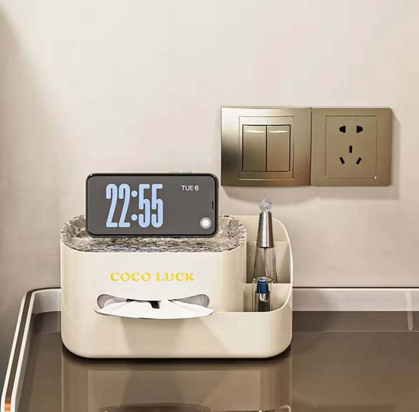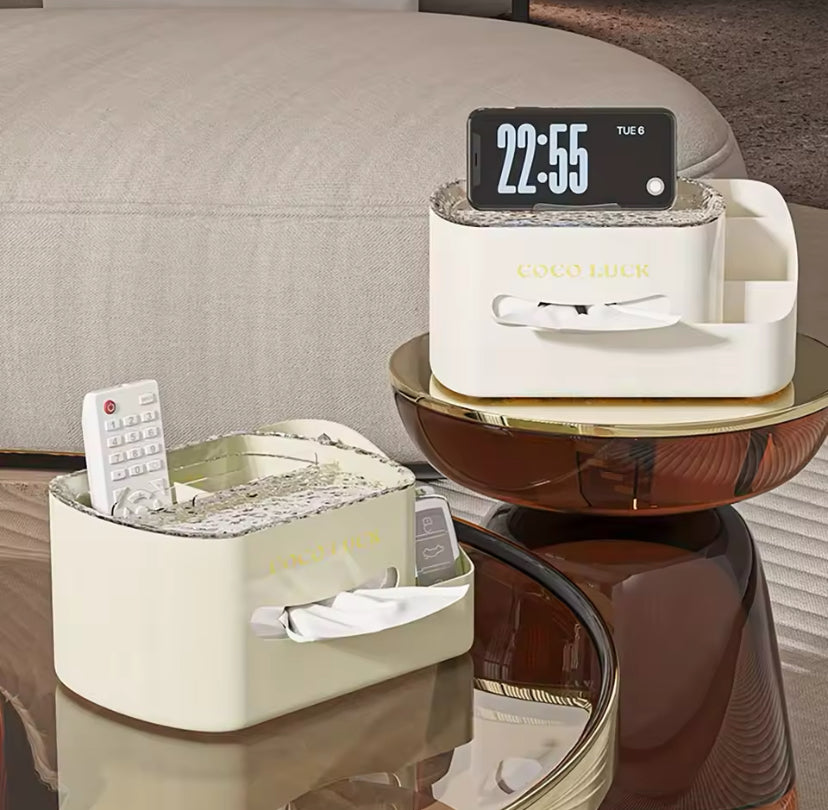 This cosmetic organizer with tissue box is a multifunctional storage solution designed to keep your makeup essentials and daily sundries neatly organised in one stylish unit. Featuring a built-in tissue box holder, this versatile organizer combines practicality with elegance, making it perfect for vanity tables, bathrooms, or desktops. With multiple compartments of varying sizes, it offers ample space to store cosmetics, skincare products, brushes, and accessories, while the top tissue compartment adds convenient access for facial tissues or wipes. Its compact yet spacious design helps reduce clutter, making your beauty routine more efficient and your space more visually appealing.