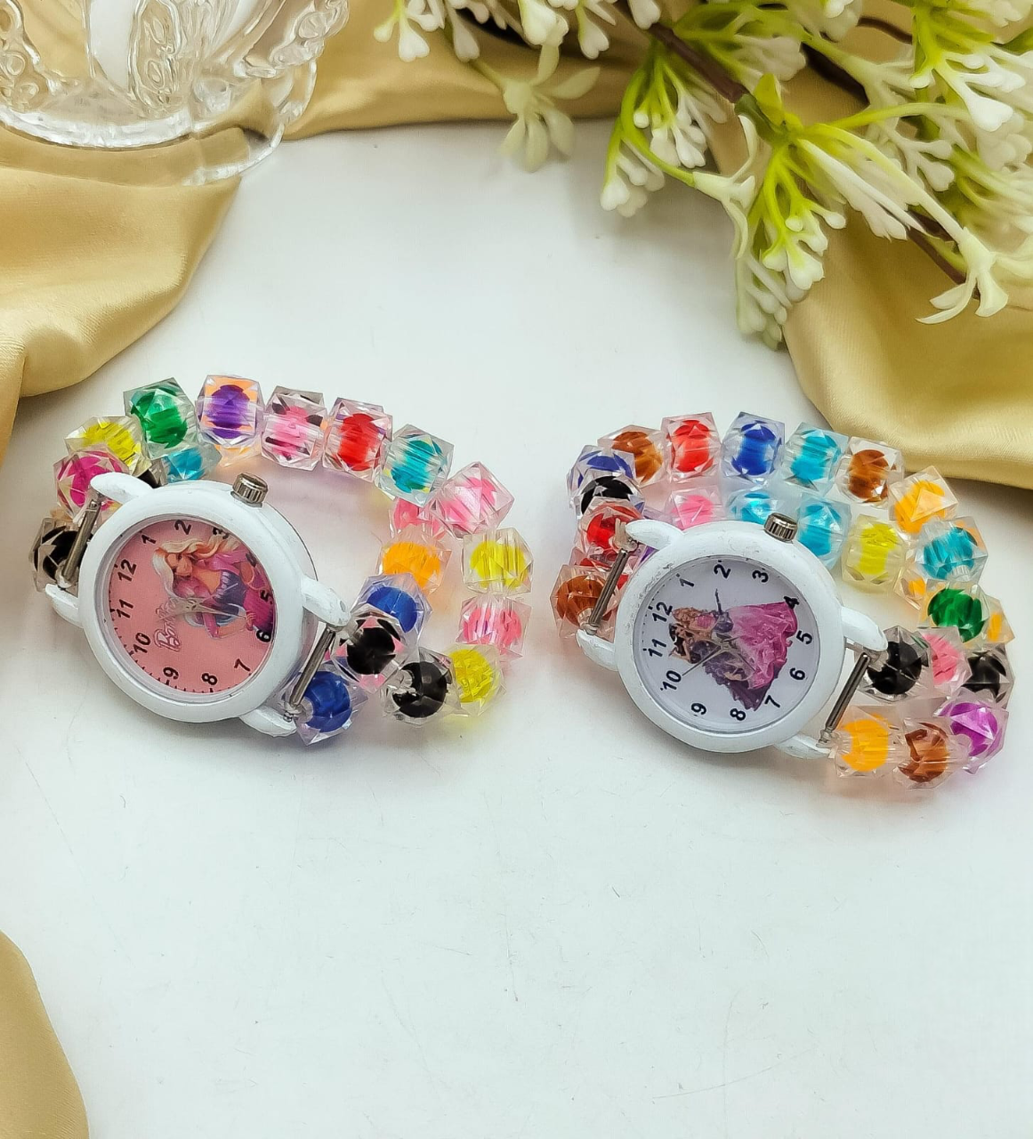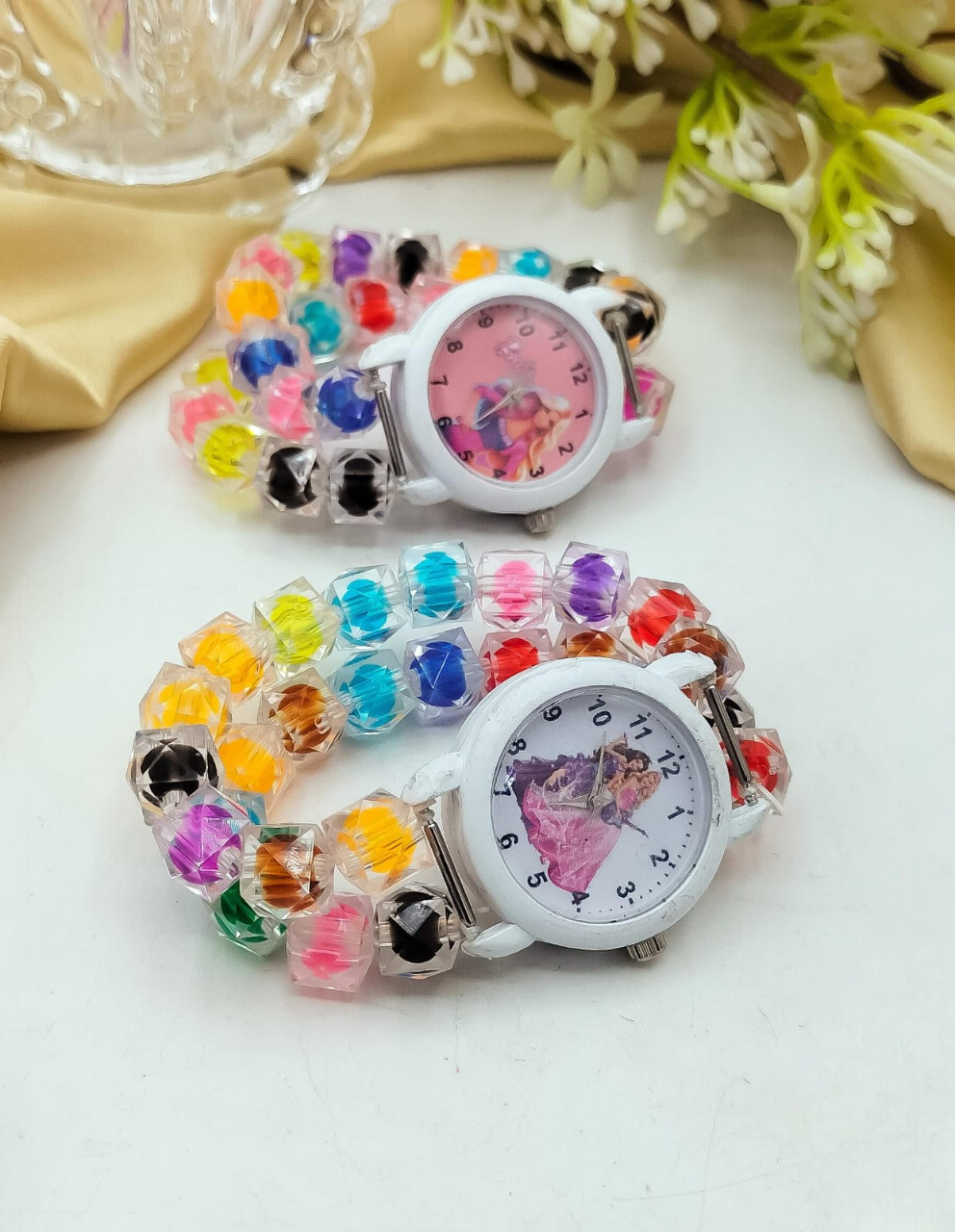 This fancy kids crystal bracelet watch is a delightful and stylish accessory designed for young fashion enthusiasts. This adjustable wristband combines the elegance of sparkling crystals with a functional watch, making it perfect for parties, special events, or everyday wear. The intricate design features a vibrant mix of colors and gemstones, offering a playful yet sophisticated look. Lightweight and comfortable, it can easily be adjusted to fit different wrist sizes, making it a charming and versatile addition to any child's jewellery collection.